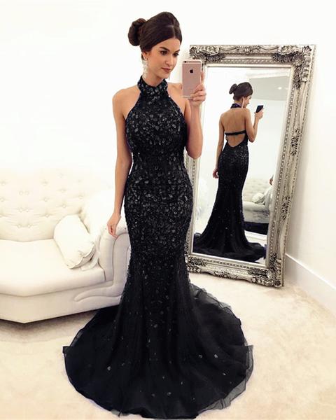 Black Prom Dress Halter Neckline, Prom Dresses, Pageant Dress, Evening Dress, Ball Dance Dresses, Graduation School Party Gown
