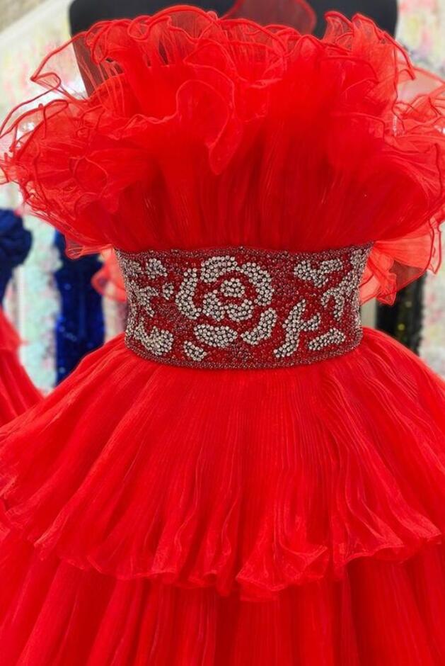 Organza Pleated Long Prom Dress with Ruffle Tiered Skirt and Beading