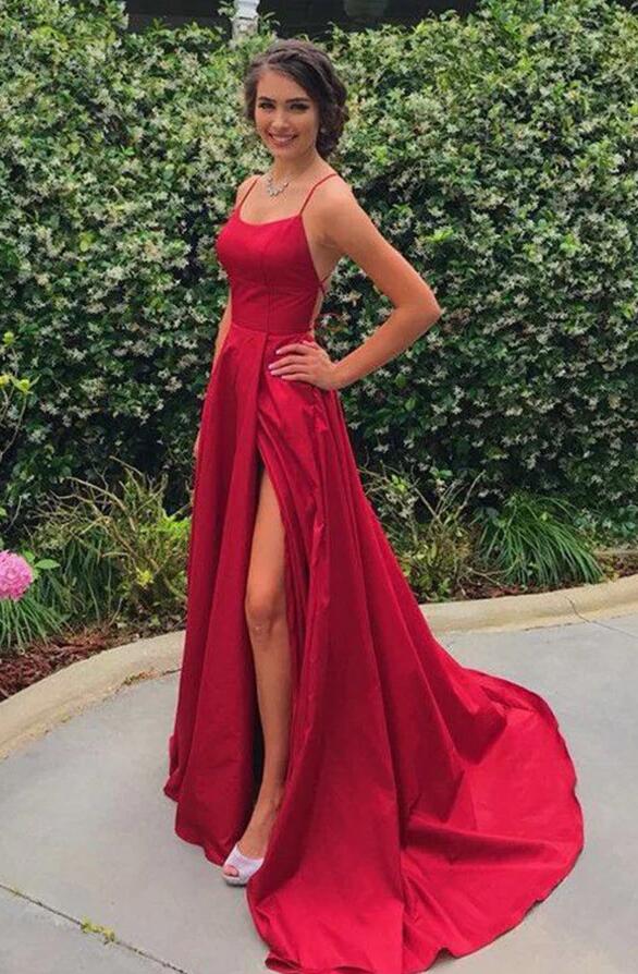 Red Sexy Side Slit Spaghetti Straps Cheap Long Prom Dresses,Formal Dresses,Dance Dress