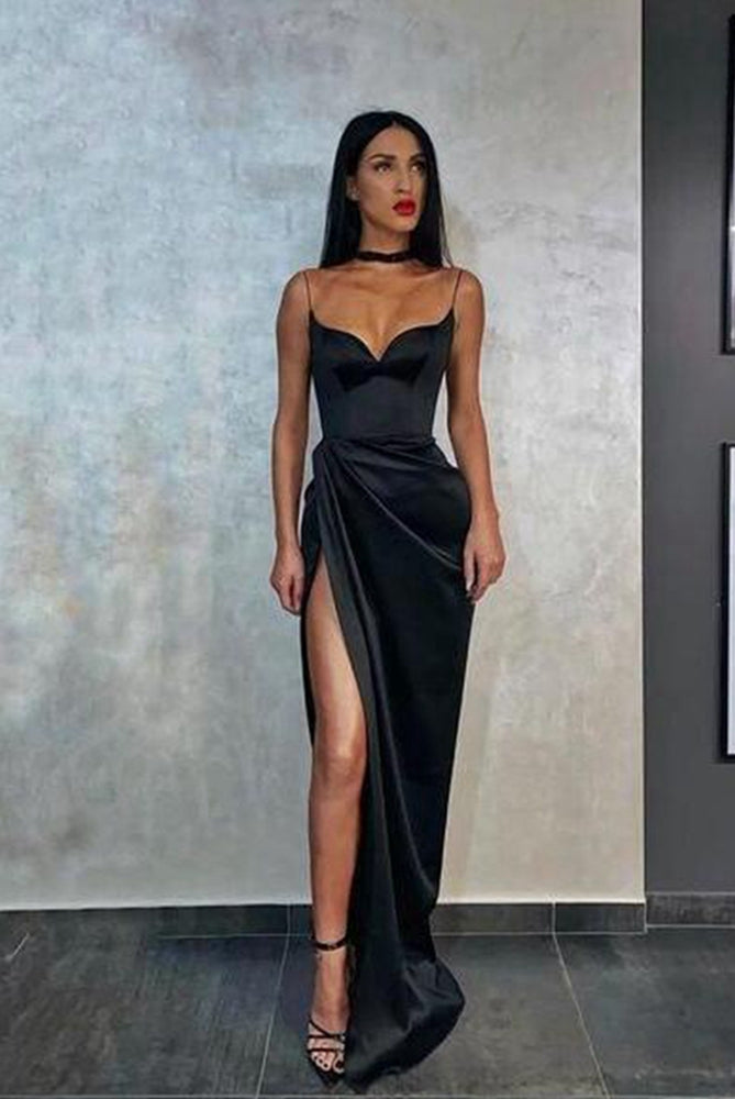 Sexy Sheath Sweetheart Black Silk Satin Long Prom Dresses with Slit,Formal Dresses