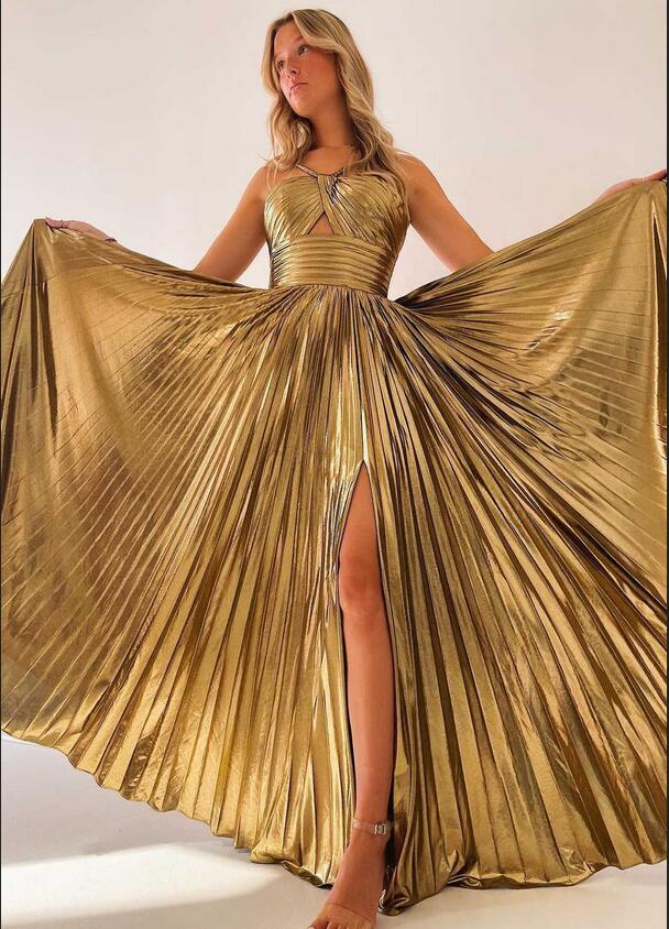 Rich metallic pleated gown with key hole bodice, braided straps and high skirt slit