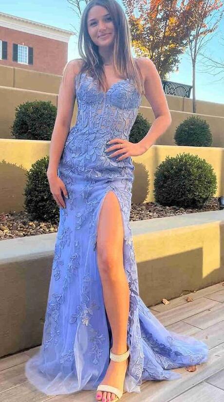 Strapless Leaf Lace Mermaid Long Prom Dress with Slit