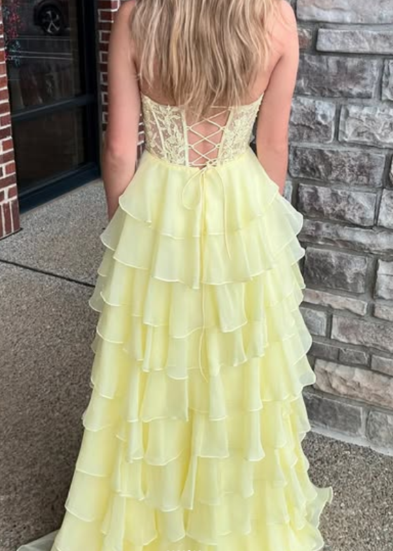 Strapless Long Prom Dress with Leaf Lace Top and Chiffon Ruffle Skirt