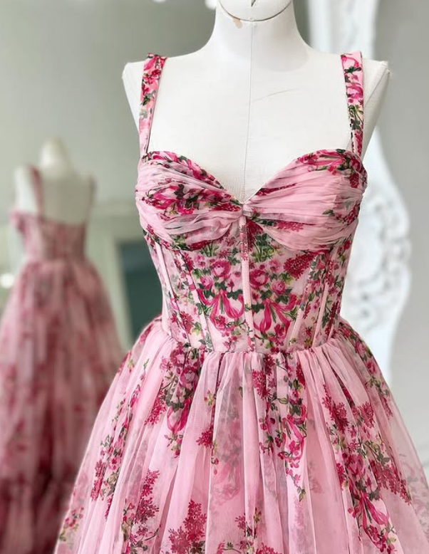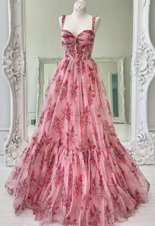 Straps A-line Floral Print Long Prom Dress