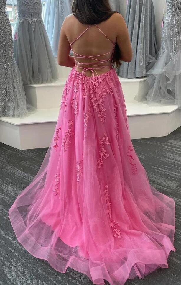 Straps Leaf Lace A-line Long Prom Dress with Slit