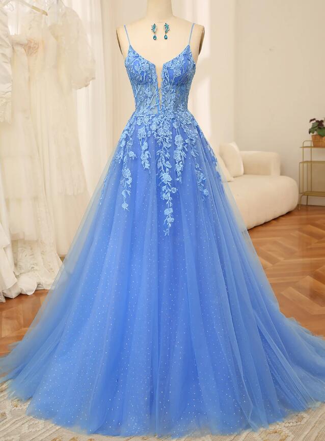 Straps Sparkly Tulle Long Prom Dress with Appliques
