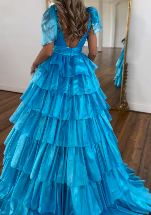 V-neck Long Prom Dress with Bow Shoulder and Ruffle Skirt